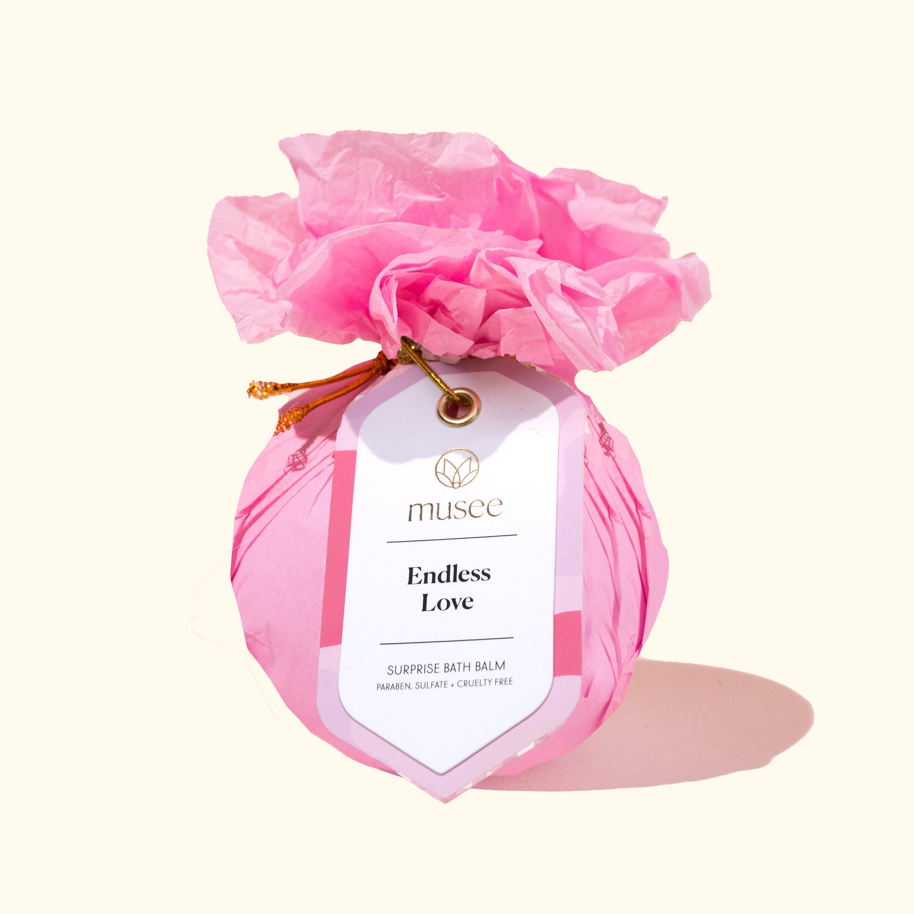 Endless Love is a pink surprise bath balm designed to turn an everyday bath into something memorable. Made with sodium bicarbonate and citric acid for a gentle, fizzy soak, and sweet almond oil to help soften and nourish skin. Fragrance oil and geranium essential oil create a fresh floral scent that feels light, clean, and uplifting.
